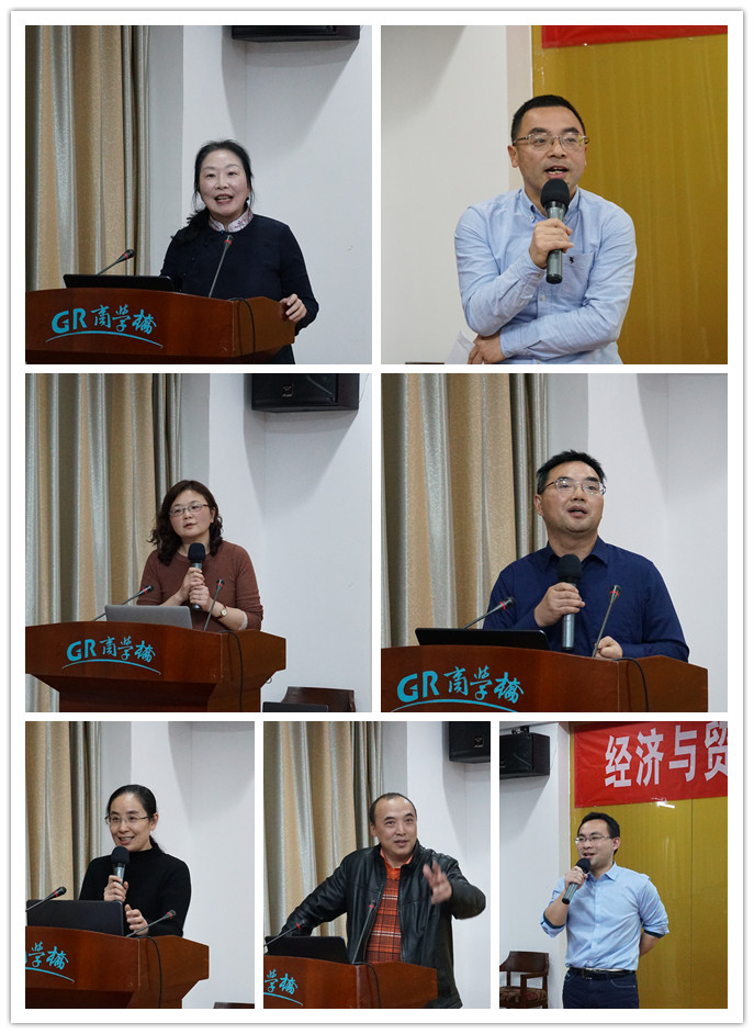 接下来,国贸系主任钱晓英、财政学系主任谭光荣、经济学系主任刘志忠,国贸系书记莫莎、教师代表罗宏斌、双创中心主任李曼、院长助理肖皓分别从课堂教学、培养方案、教学模式、现代技术在课堂的运用、督导与评价的促进作用、提高欧洲杯现场直播
